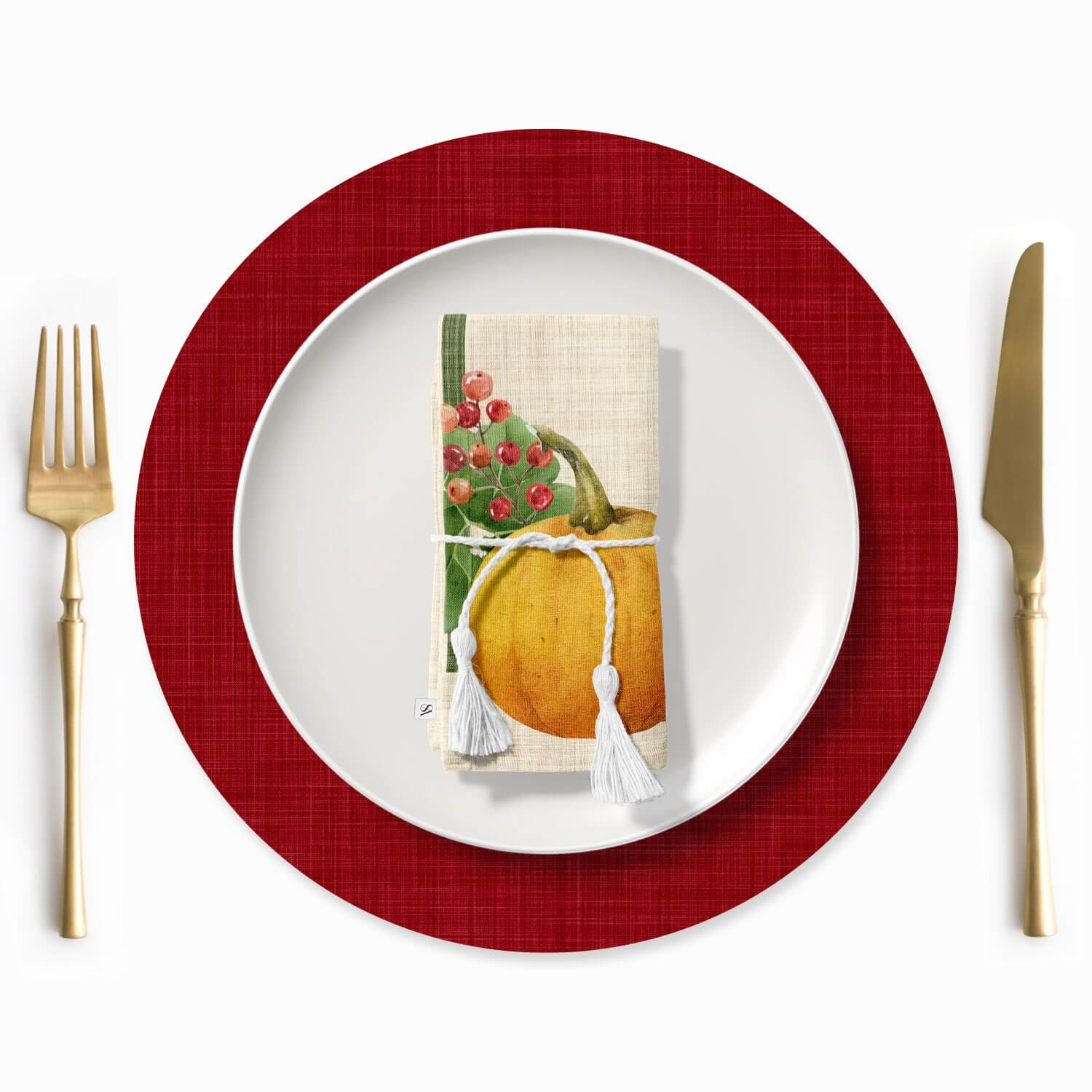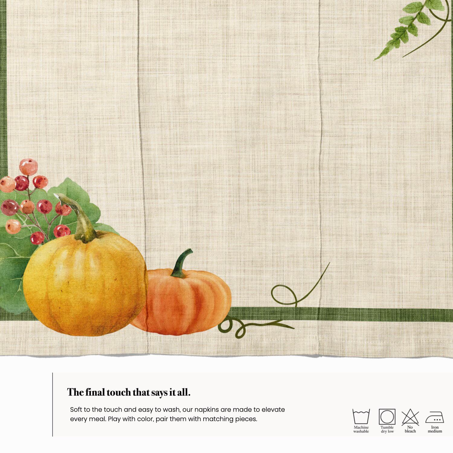 Celebrate autumn’s warmth with our Pumpkin Harvest Napkin. Featuring golden pumpkins, lush greenery, and berry sprigs in each corner, this design frames your place setting with seasonal elegance. Perfect for Thanksgiving feasts or cozy fall dinners, it adds a festive, nature inspired charm to every meal.