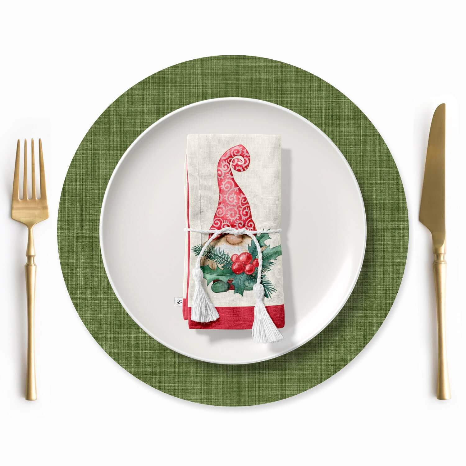 Encantadora y alegre, esta servilleta presenta un simpático gnomo navideño en tonos rojos con detalles verdes y bayas invernales. Su diseño aporta un toque de magia y diversión a la mesa, perfecto para celebraciones familiares llenas de espíritu festivo.