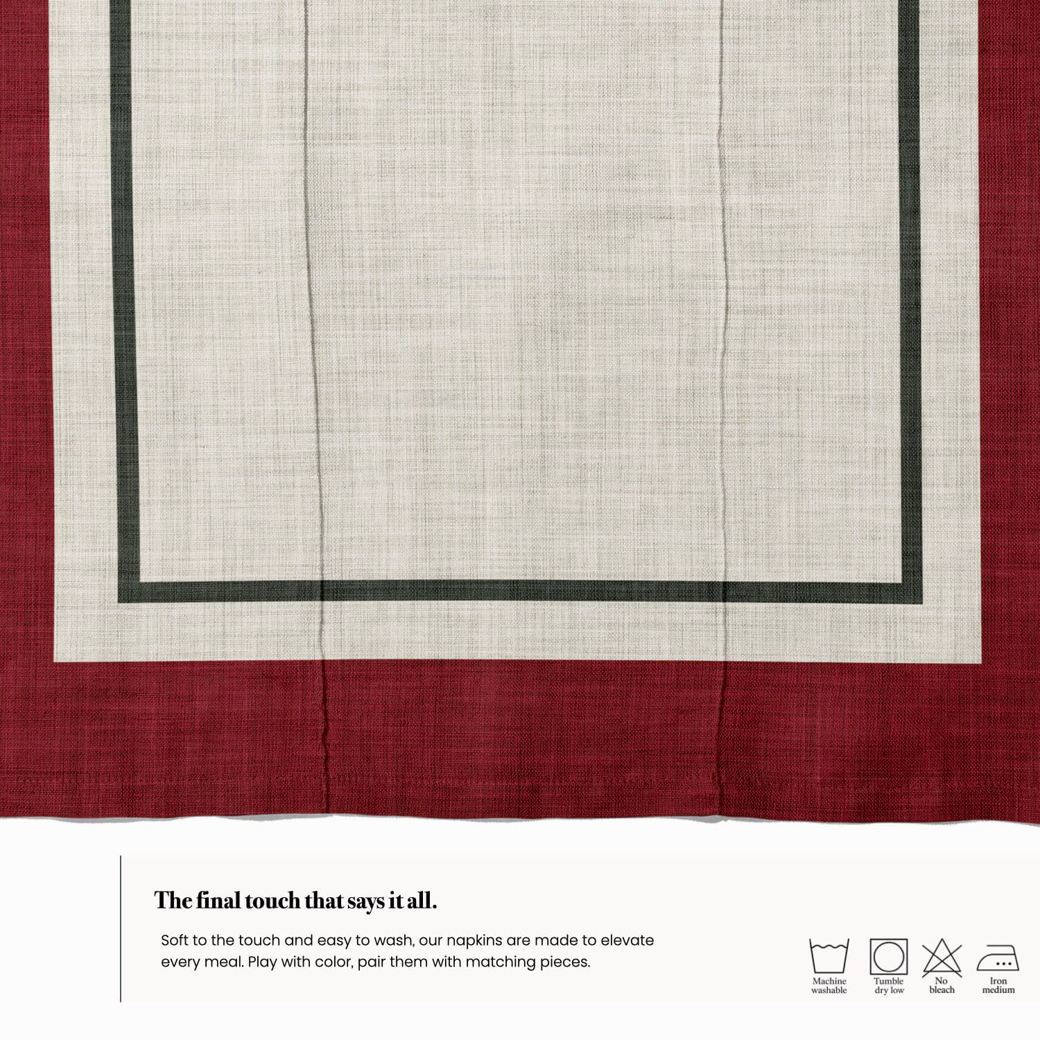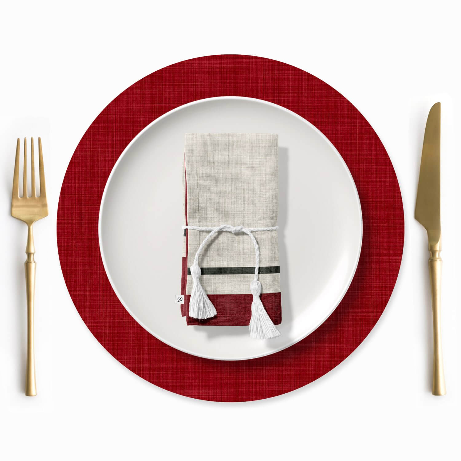 Un diseño elegante y atemporal que combina la suavidad del tono lino con un marco rojo intenso y una línea gris sutil. Aporta un toque refinado y cálido a cualquier mesa, ideal para cenas familiares o celebraciones especiales.