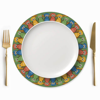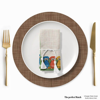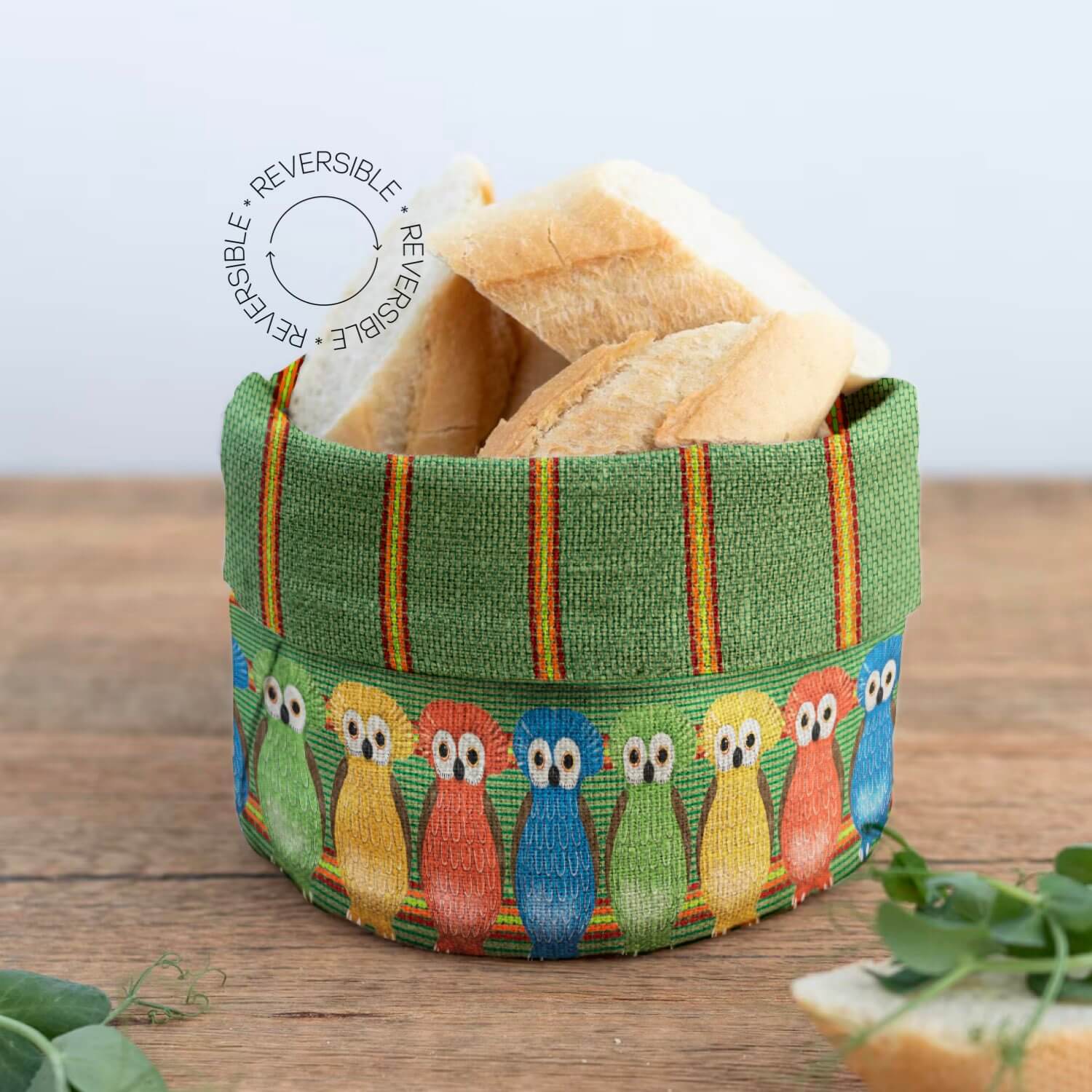 Bright eyes, bold colors, everyday joy. Our Owl Moss Reversible Bread Basket brings a playful rainbow of owls to your table, perched on a huipil inspired backdrop. The outer fabric showcases vivid greens, oranges, blues, and reds, while the foldover reveals a green toned interior for a balanced, reversible look.