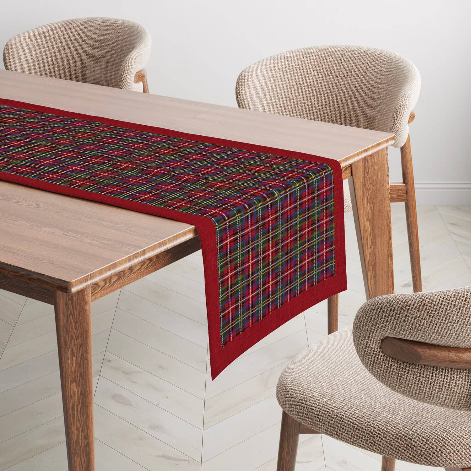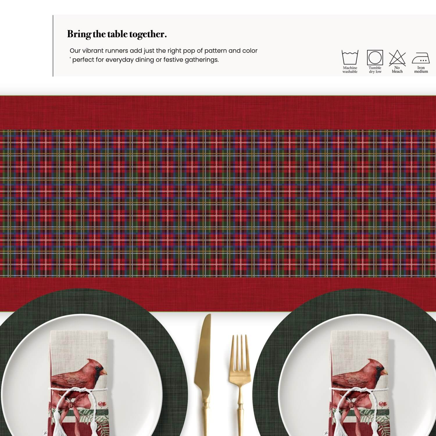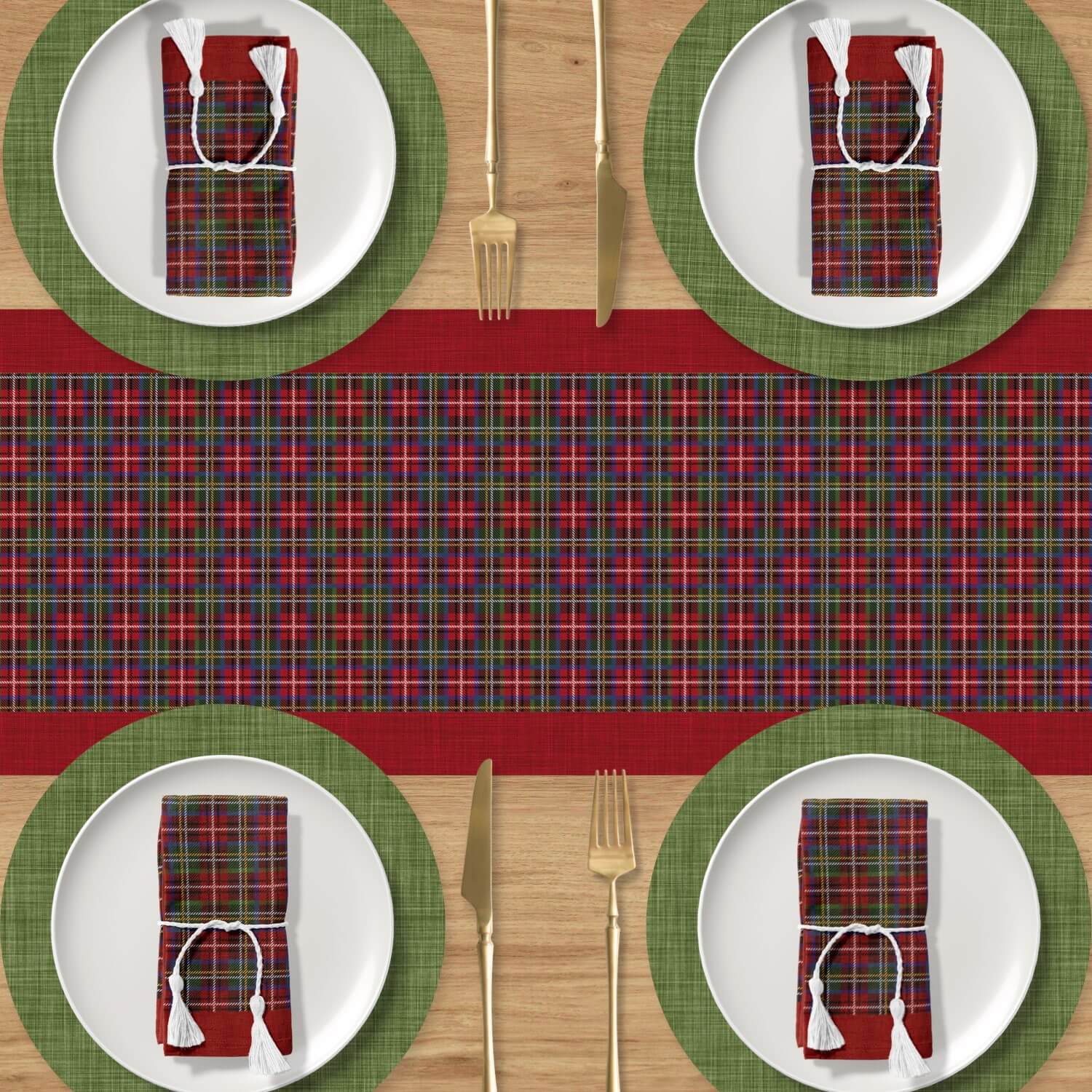 • Clásico, acogedor y festivo. Nuestro camino de mesa Tartan combina tonos tradicionales de rojo, verde y azul con un borde rojo profundo que enmarca su diseño escocés. Ideal para crear mesas llenas de calidez y espíritu navideño, celebrando la tradición con un toque de elegancia atemporal.