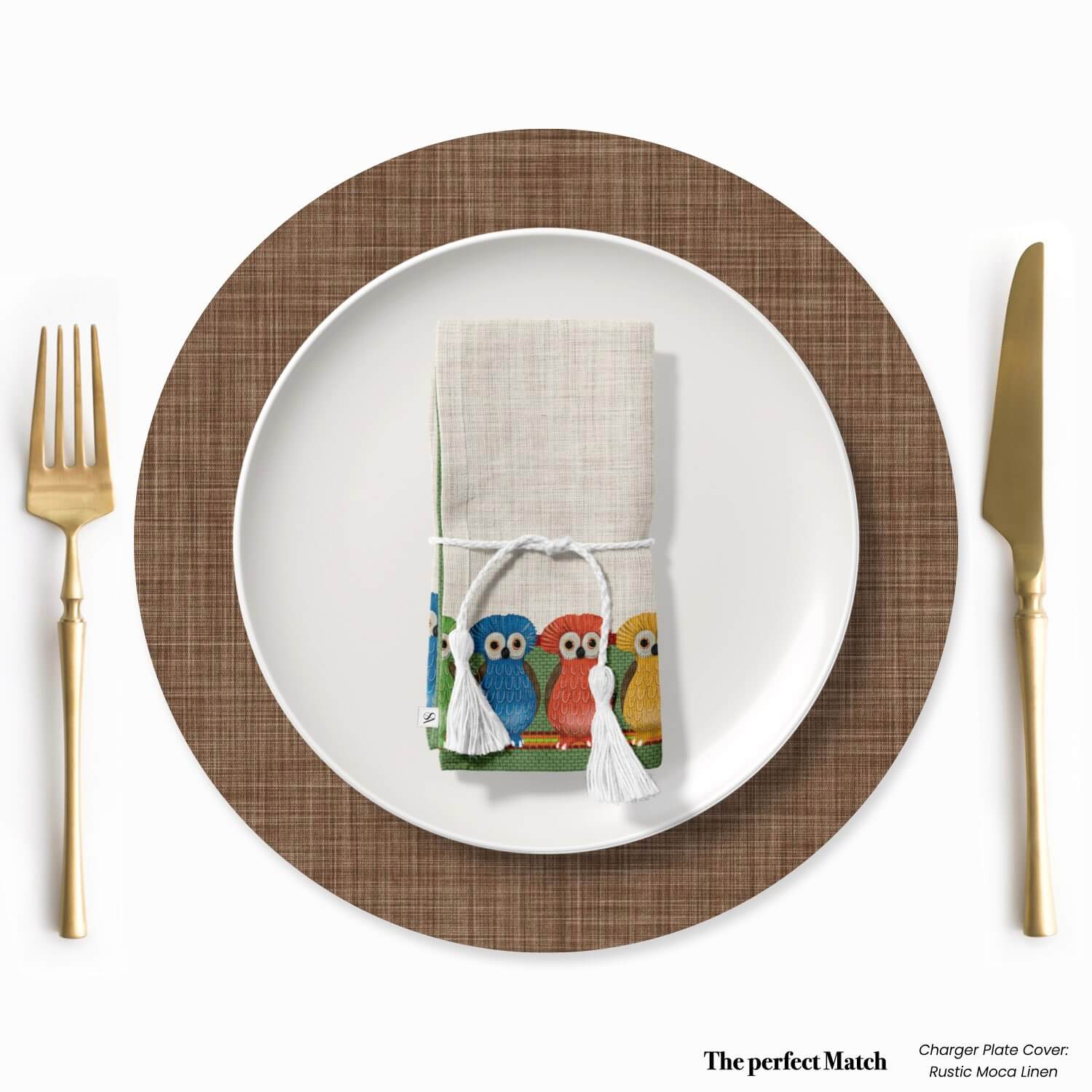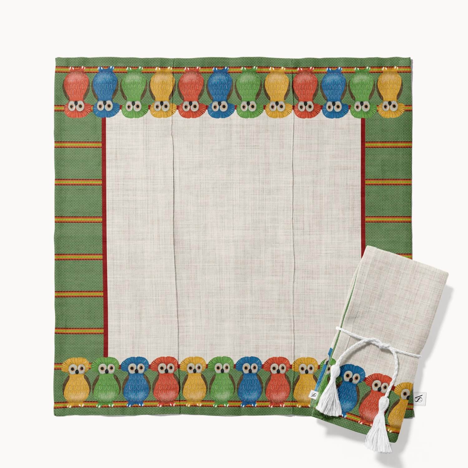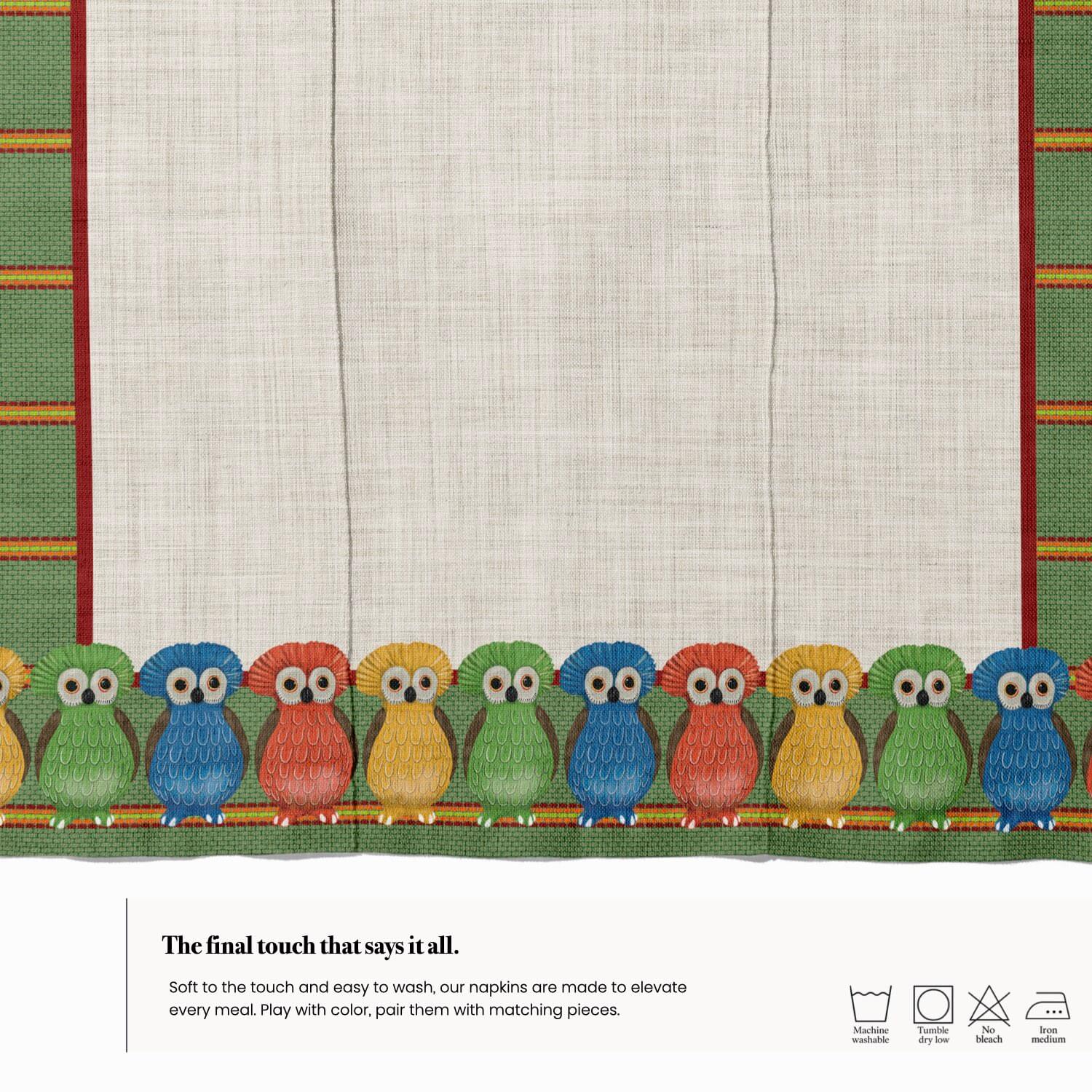Celebrate vibrant heritage at your table with our Multicolor Tecolote Moss Napkin. Inspired by Guatemala’s artisan traditions, it features rows of colorful owls each with its own personality set against a soft cream center. A moss green border with orange and red stripes frames the design, blending playful charm with cultural richness.