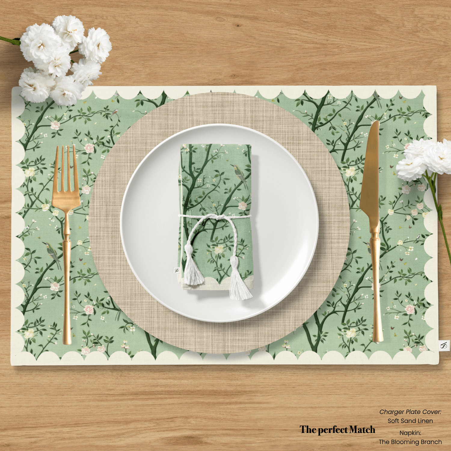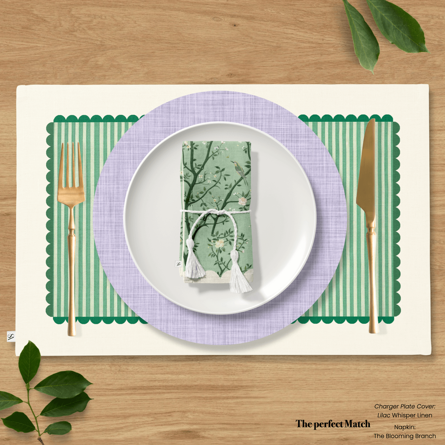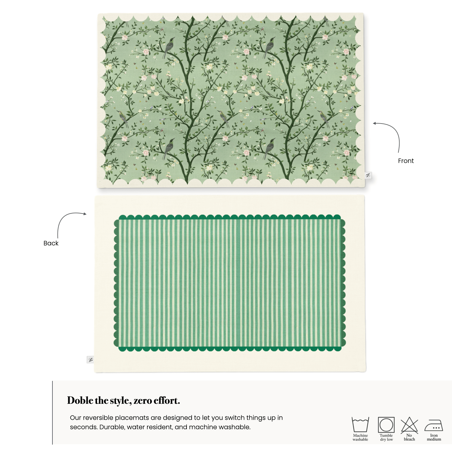 A graceful take on garden charm. Our Blooming Branch Reversible Placemat features flowering branches and perched birds on a soft sage green background, framed by a scalloped border that feels both elegant and playful. Flip it over for a classic green pinstripe with matching scalloped trim versatile, fresh, and full of life.
