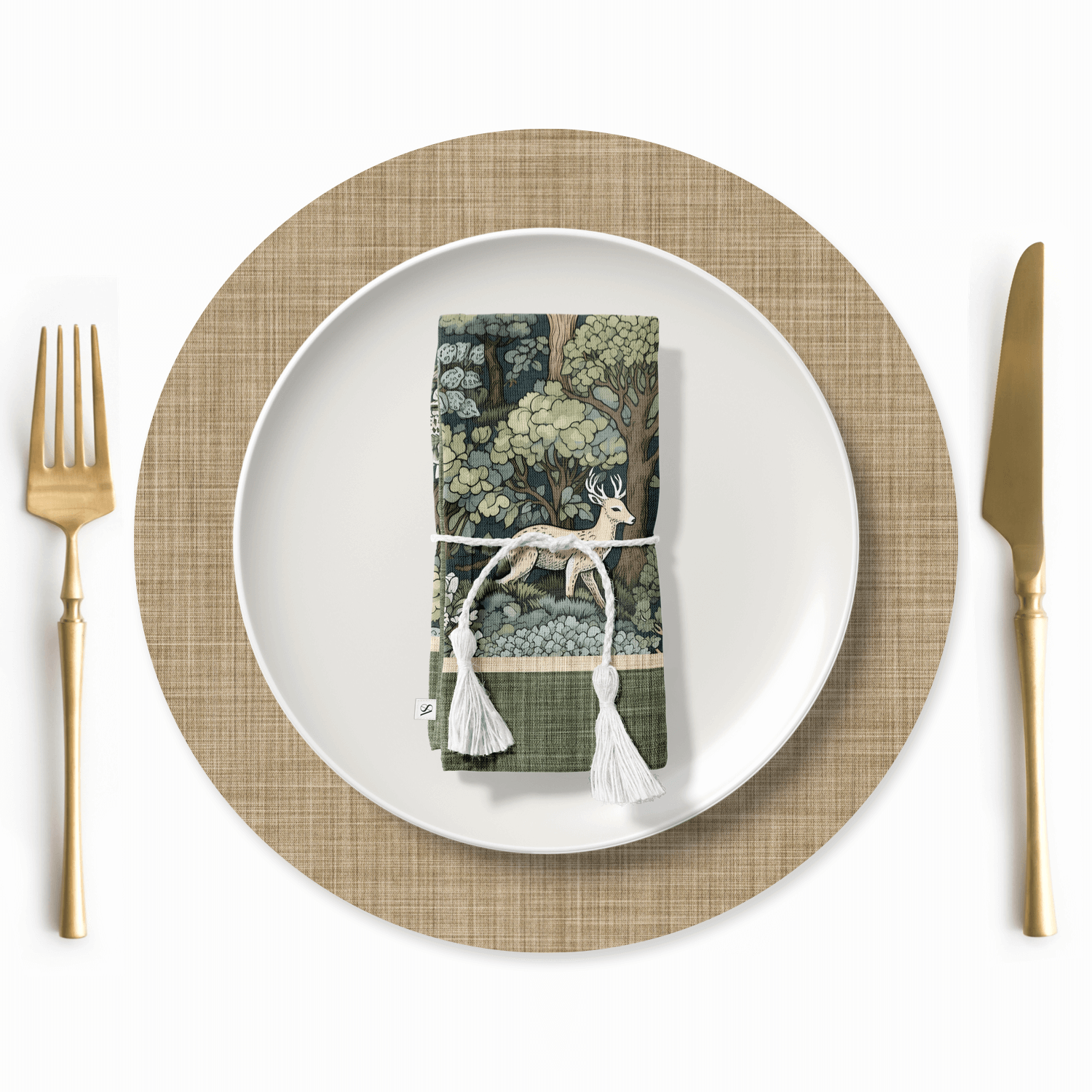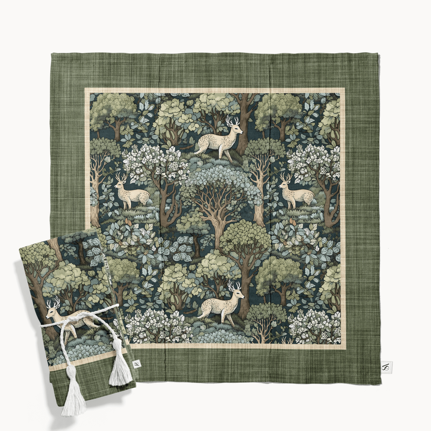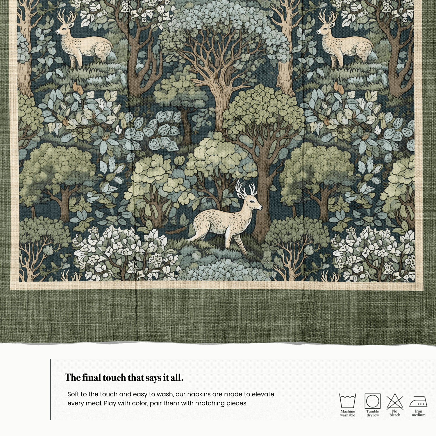 Inspirada en la belleza serena del bosque invernal, nuestra servilleta Winter Woodland combina tonos verdes suaves con ilustraciones de ciervos y árboles que evocan calma y naturaleza. Hecha a mano en Guatemala con tela de apariencia tipo lino e impermeable, añade un toque acogedor y sofisticado a tu mesa.