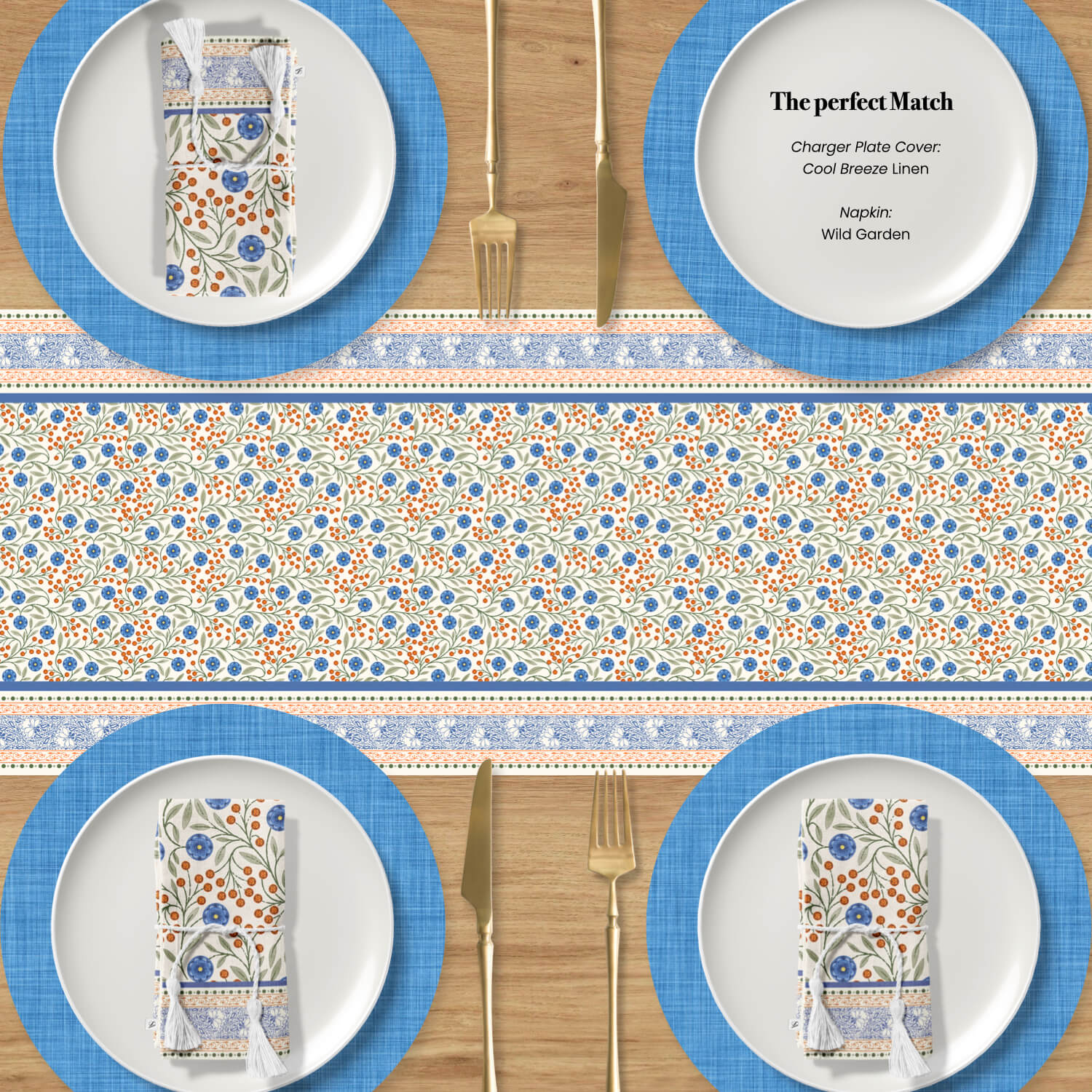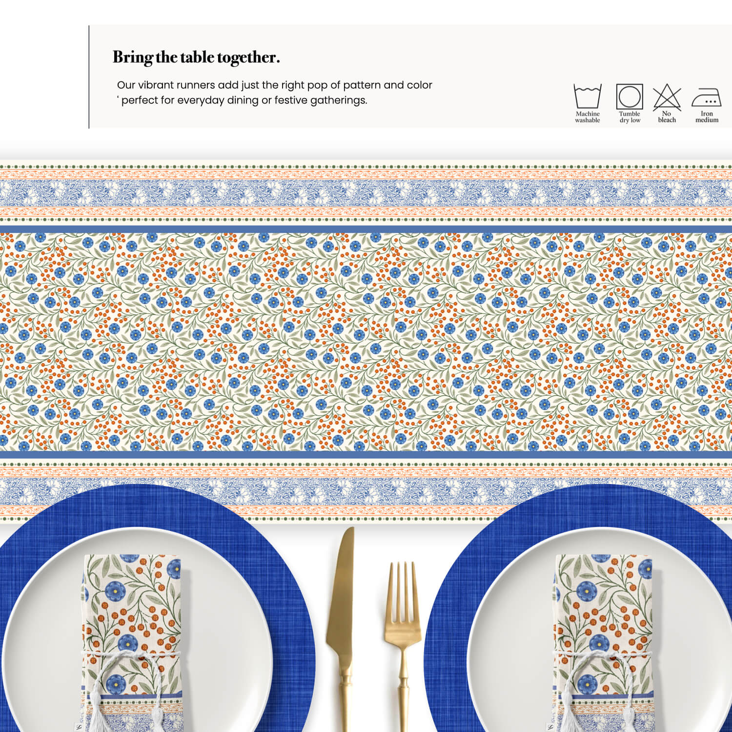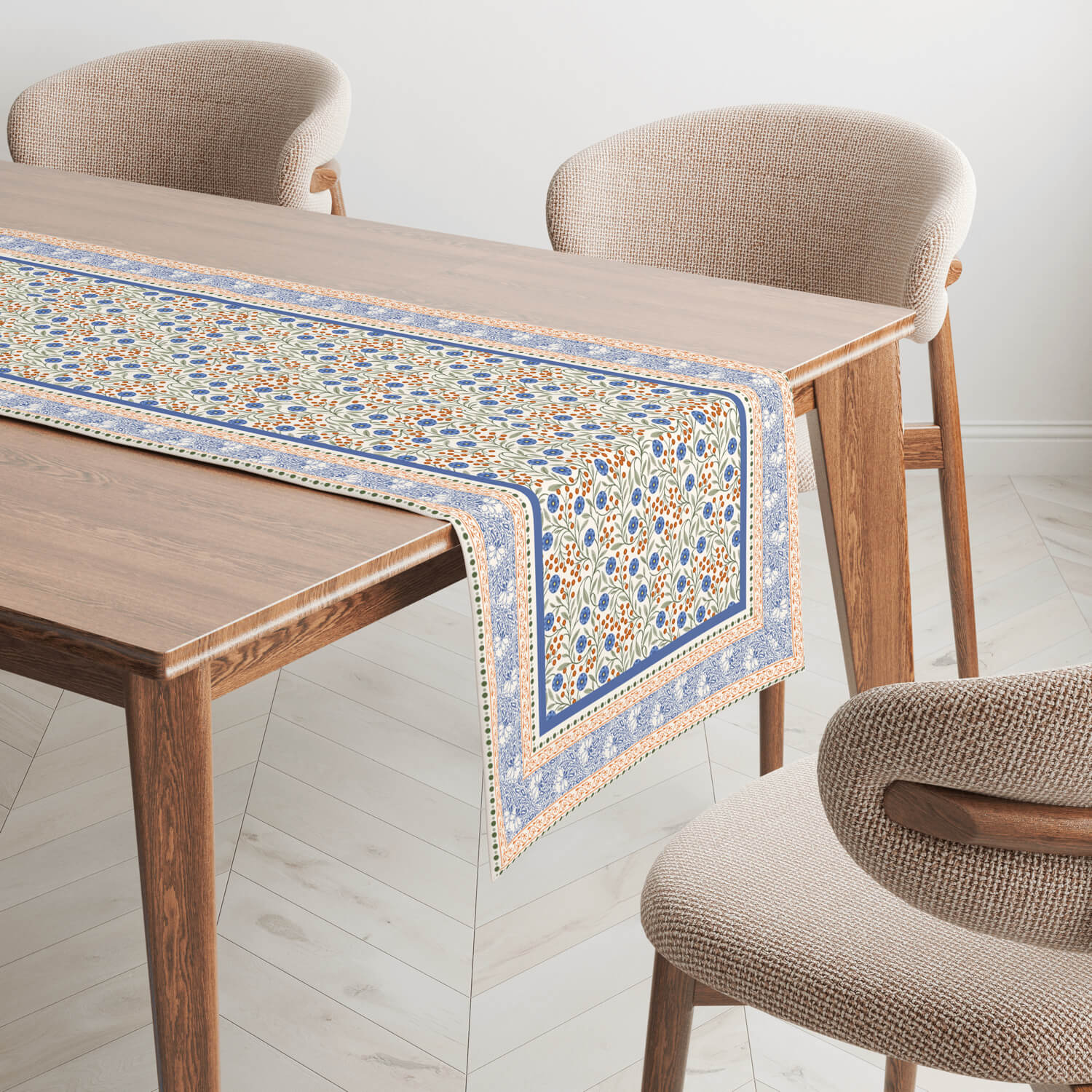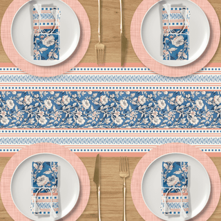 Add a storybook charm to your meals with our Wild Garden Table Runner. Inspired by classic European florals, it bursts with delicate blossoms in rust, navy, and soft blue tones, arranged in a tapestry like pattern. Layered borders in complementary prints frame the design vibrant, timeless, and full of character.