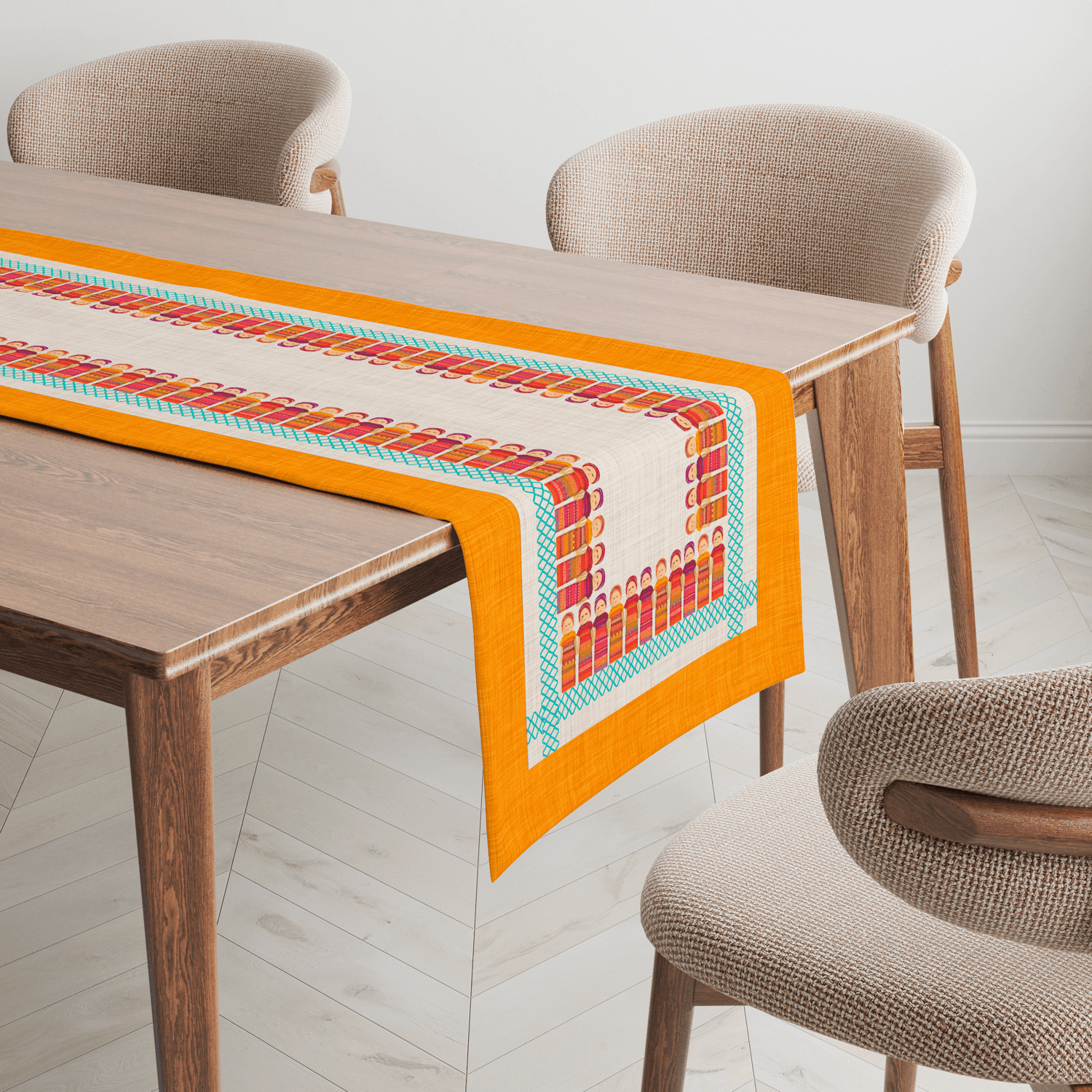Our Gold Sienna Worry Doll Linen Table Runner adds sunshine and folklore to your table. Rows of colorful worry dolls line a cream center, framed by a bold golden orange border with turquoise details that echo Guatemalan markets. Durable and linen like, it’s practical yet full of heart perfect for joyful gatherings or everyday meals.